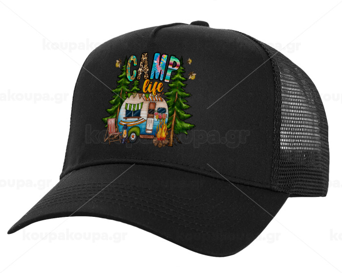 Camp Life, Structured Trucker Adult Hat, with Mesh, Black (100% COTTON, ADULT, UNISEX, ONE SIZE)
