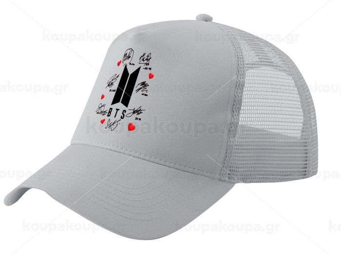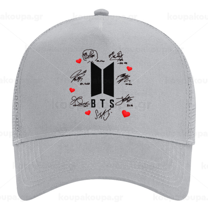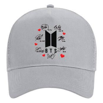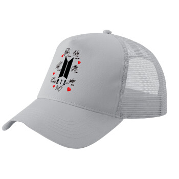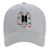 BTS signs, Adult Structured Trucker Hat, with Mesh, GRAY (100% COTTON, ADULT, UNISEX, ONE SIZE)