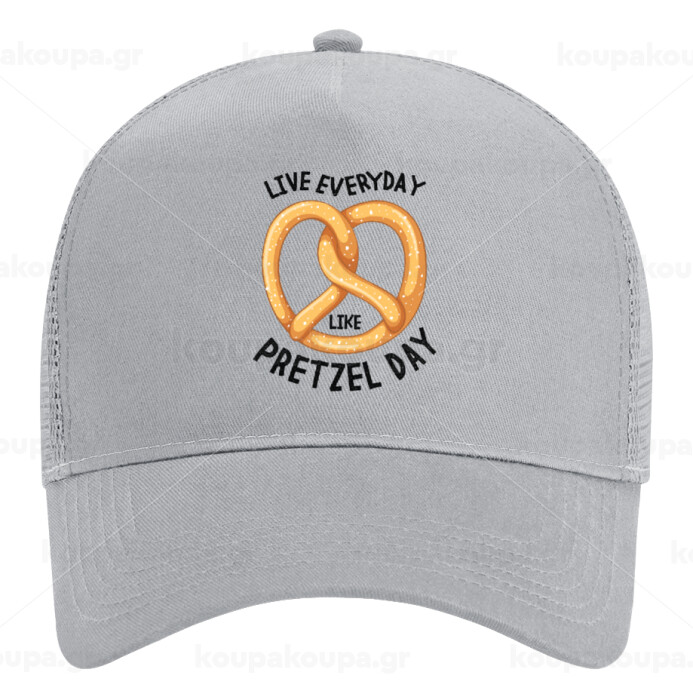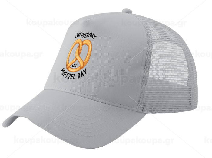 The office, Live every day like pretzel day, Adult Structured Trucker Hat, with Mesh, GRAY (100% COTTON, ADULT, UNISEX, ONE SIZE)