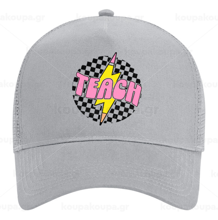 Teach, Adult Structured Trucker Hat, with Mesh, GRAY (100% COTTON, ADULT, UNISEX, ONE SIZE)