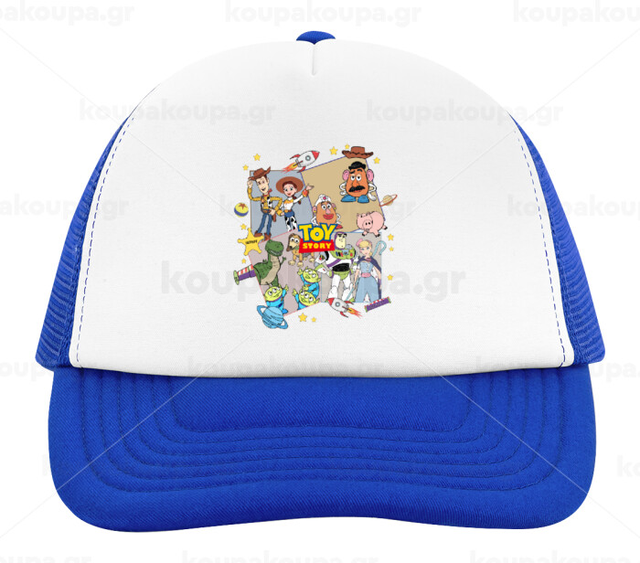 toystory characters, Adult Soft Trucker Hat with Blue/White Mesh (POLYESTER, ADULT, UNISEX, ONE SIZE)