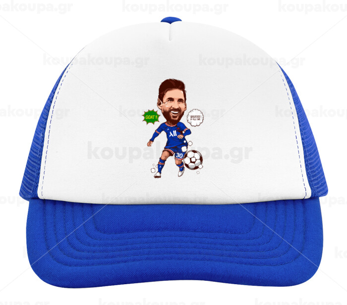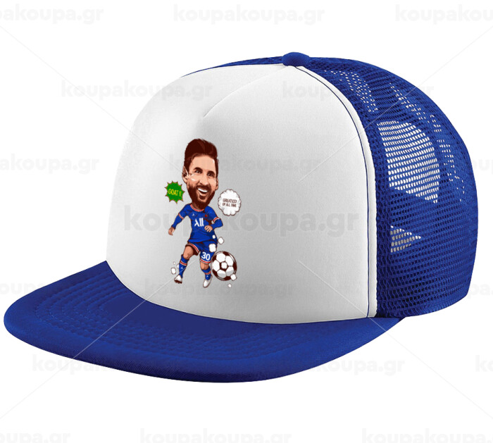 Lionel Messi drawing, Adult Soft Trucker Hat with Blue/White Mesh (POLYESTER, ADULT, UNISEX, ONE SIZE)