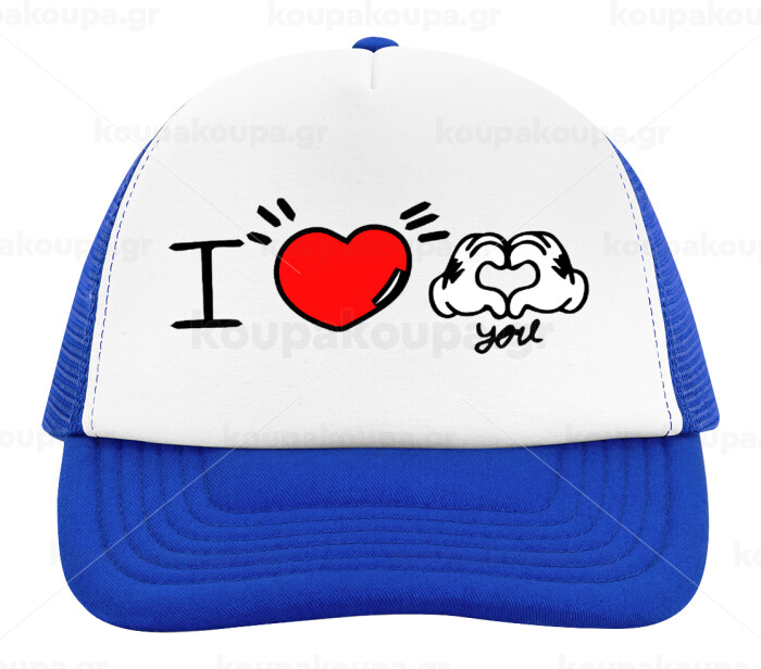 comics hands love, Adult Soft Trucker Hat with Blue/White Mesh (POLYESTER, ADULT, UNISEX, ONE SIZE)