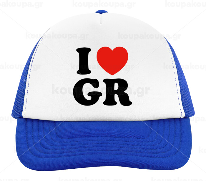 I Love GR, Adult Soft Trucker Hat with Blue/White Mesh (POLYESTER, ADULT, UNISEX, ONE SIZE)