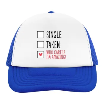 Single, Taken, Who cares i'm amazing, Adult Soft Trucker Hat with Blue/White Mesh (POLYESTER, ADULT, UNISEX, ONE SIZE)