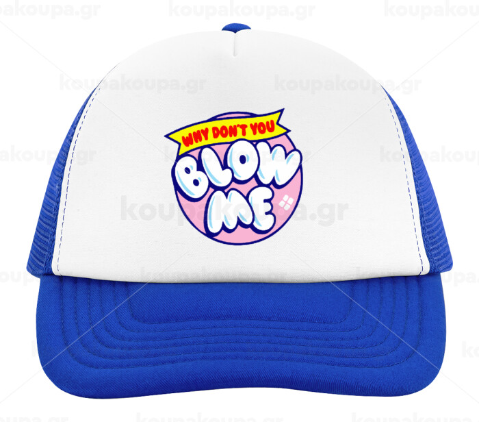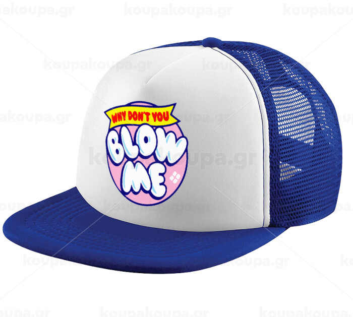 Why Don't You Blow Me Funny, Adult Soft Trucker Hat with Blue/White Mesh (POLYESTER, ADULT, UNISEX, ONE SIZE)