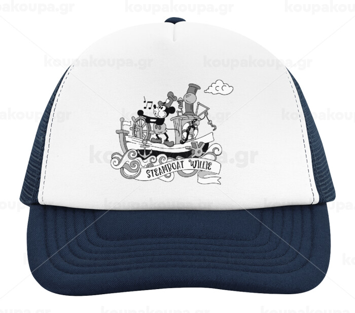 Mickey steamboat, Adult Soft Trucker Hat with Dark Blue/White Mesh (POLYESTER, ADULT, UNISEX, ONE SIZE)