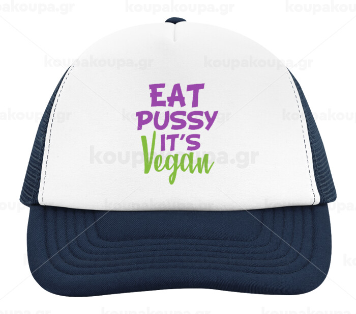EAT pussy it's vegan, Adult Soft Trucker Hat with Dark Blue/White Mesh (POLYESTER, ADULT, UNISEX, ONE SIZE)