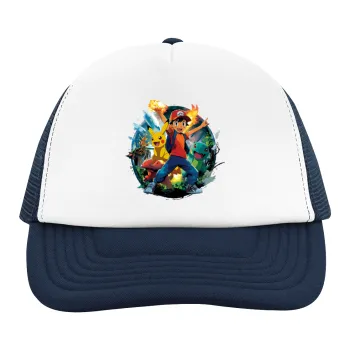 Ash Ketchum & Pikachu, Adult Soft Trucker Hat with Dark Blue/White Mesh (POLYESTER, ADULT, UNISEX, ONE SIZE)