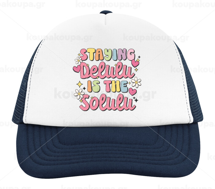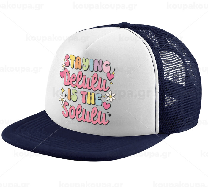 Delulu, Adult Soft Trucker Hat with Dark Blue/White Mesh (POLYESTER, ADULT, UNISEX, ONE SIZE)