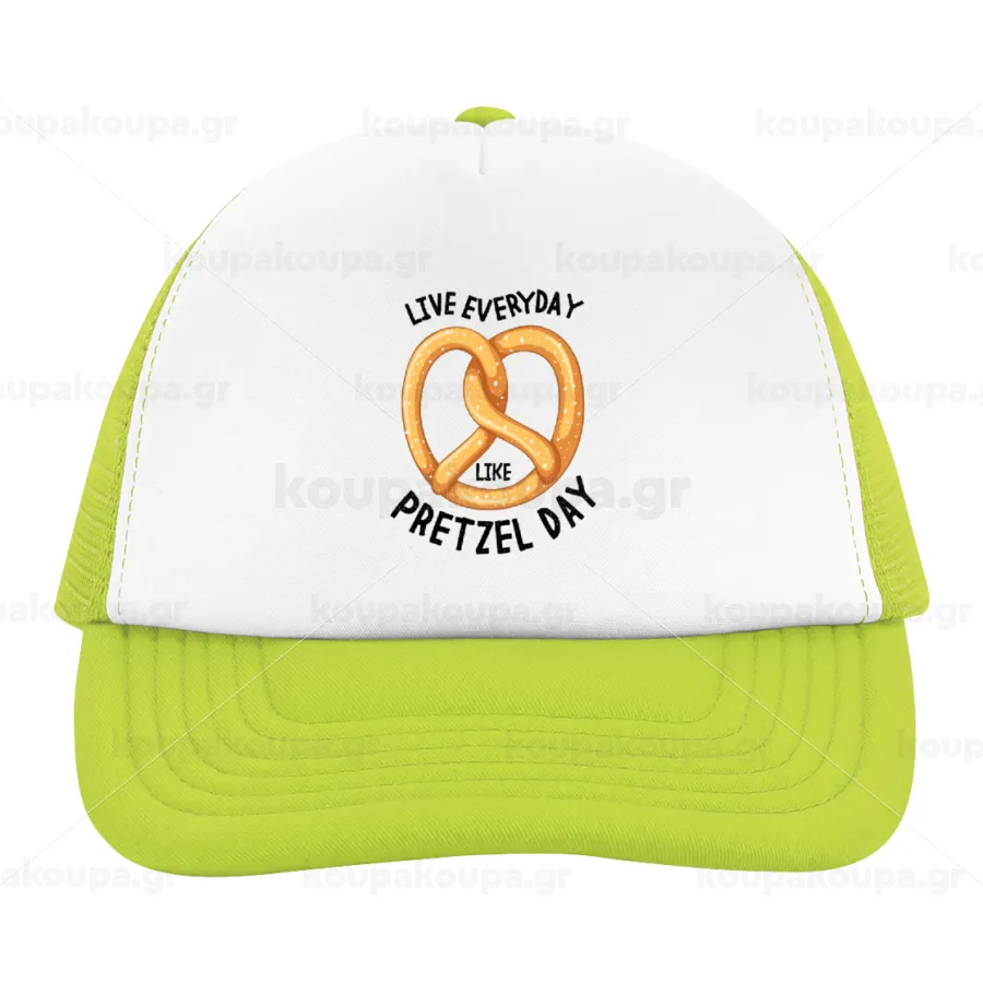 The office, Live every day like pretzel day, Adult Soft Trucker Hat with Mesh GREEN/WHITE (POLYESTER, ADULT, ONE SIZE)