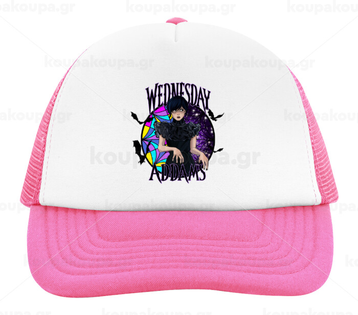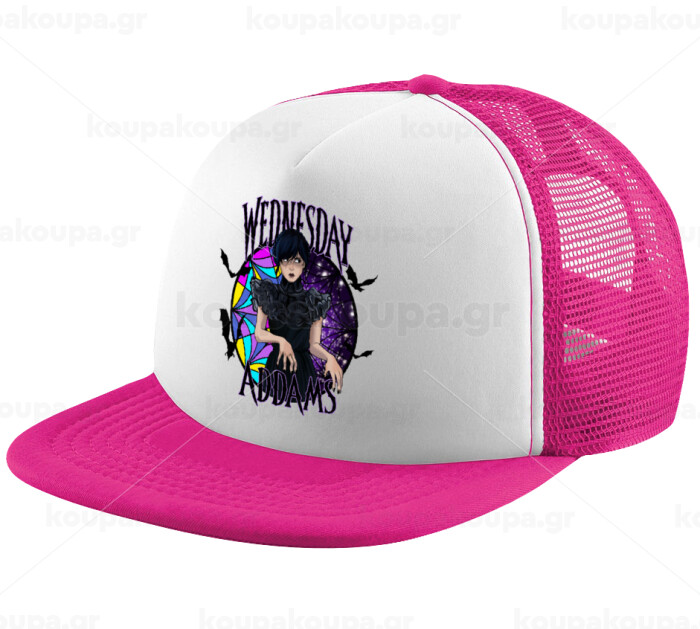 Wednesday Jenna Ortega, Adult Soft Trucker Hat with Pink/White Mesh (POLYESTER, ADULT, UNISEX, ONE SIZE)