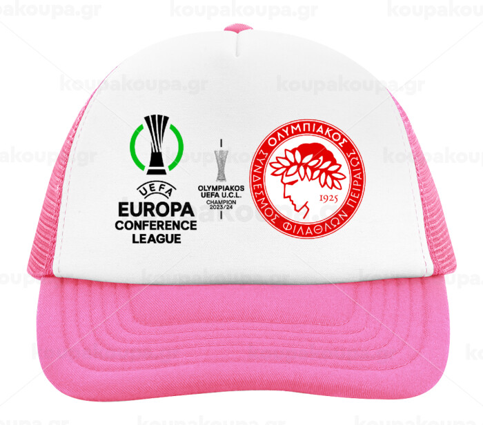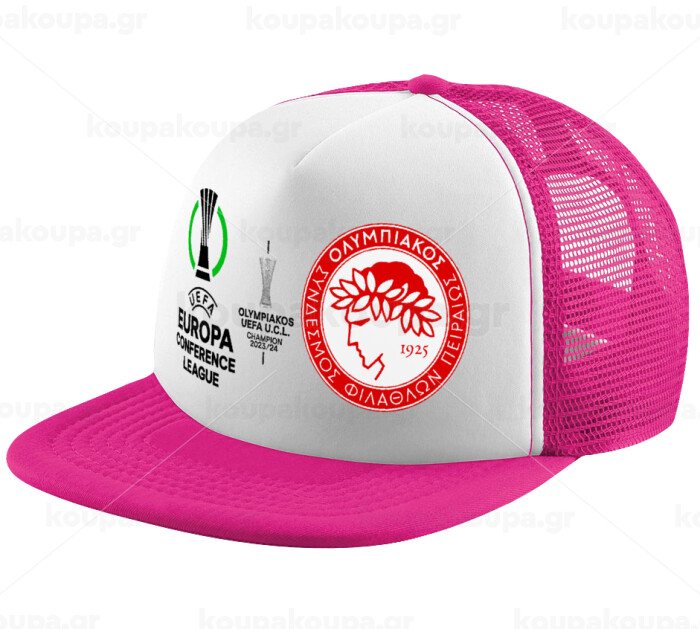 Olympiacos UEFA Europa Conference League Champion 2023/24, Adult Soft Trucker Hat with Pink/White Mesh (POLYESTER, ADULT, UNISEX, ONE SIZE)