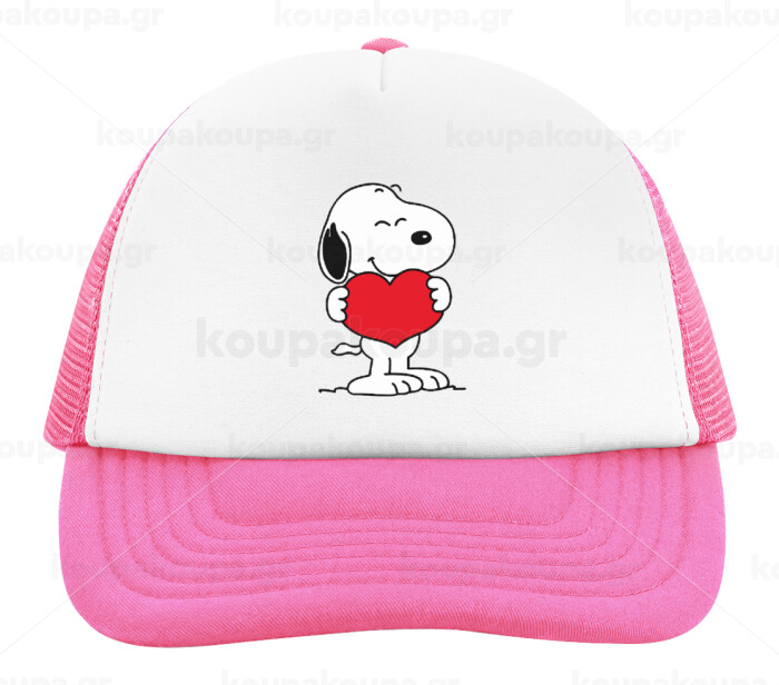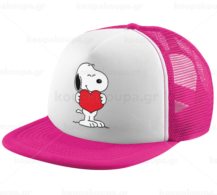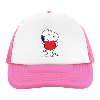 Snoopy takemy heart, Adult Soft Trucker Hat with Pink/White Mesh (POLYESTER, ADULT, UNISEX, ONE SIZE)