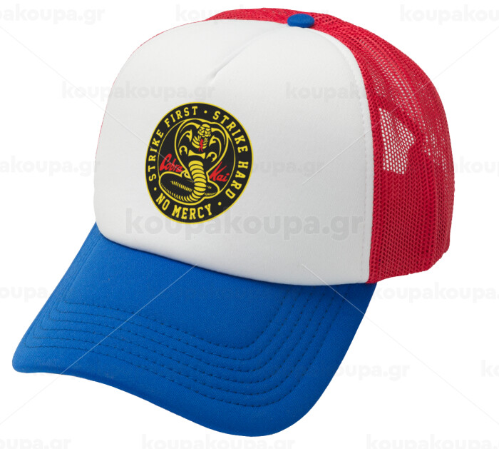 cobra kai strike first dojo, Adult Soft Trucker Hat with Red/Blue/White Mesh (POLYESTER, ADULT, UNISEX, ONE SIZE)