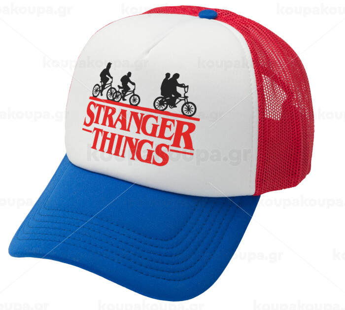 Stranger Things red, Adult Soft Trucker Hat with Red/Blue/White Mesh (POLYESTER, ADULT, UNISEX, ONE SIZE)