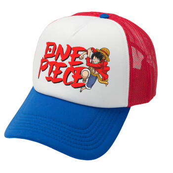 One Piece, Adult Soft Trucker Hat with Red/Blue/White Mesh (POLYESTER, ADULT, UNISEX, ONE SIZE)