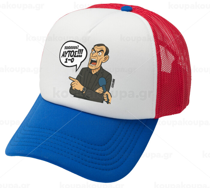 Μπαρτζό, Ποιος? Αυτός!!! 1-0, Adult Soft Trucker Hat with Red/Blue/White Mesh (POLYESTER, ADULT, UNISEX, ONE SIZE)