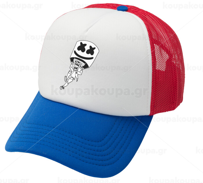 Fortnite Marshmello, Adult Soft Trucker Hat with Red/Blue/White Mesh (POLYESTER, ADULT, UNISEX, ONE SIZE)