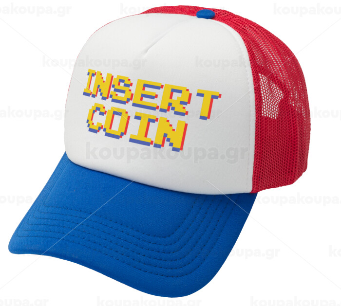 Insert coin!!!, Adult Soft Trucker Hat with Red/Blue/White Mesh (POLYESTER, ADULT, UNISEX, ONE SIZE)