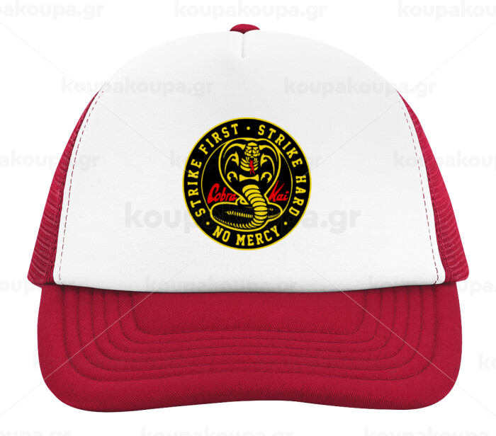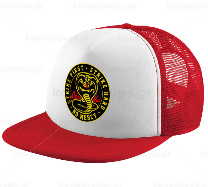 cobra kai strike first dojo, Adult Soft Trucker Hat with Red/White Mesh (POLYESTER, ADULT, UNISEX, ONE SIZE)