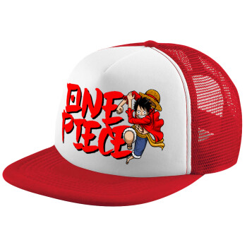 One Piece, Adult Soft Trucker Hat with Red/White Mesh (POLYESTER, ADULT, UNISEX, ONE SIZE)