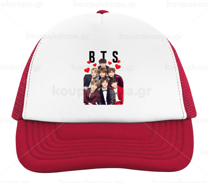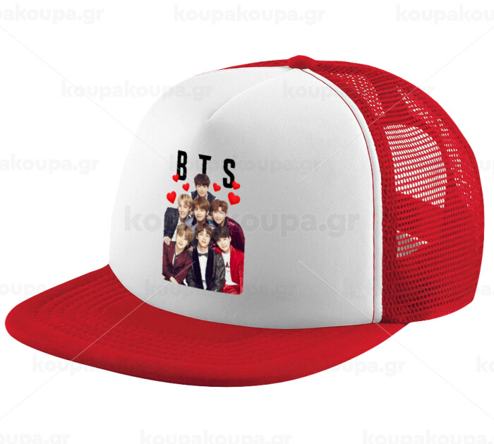 BTS hearts, Adult Soft Trucker Hat with Red/White Mesh (POLYESTER, ADULT, UNISEX, ONE SIZE)