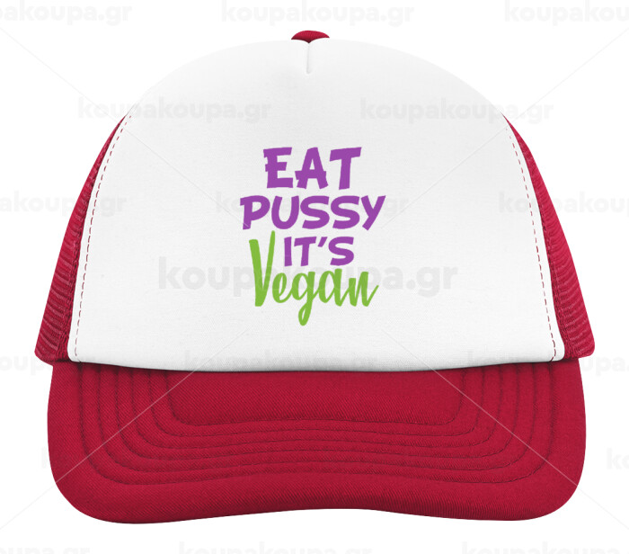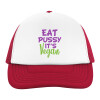 EAT pussy it's vegan, Adult Soft Trucker Hat with Red/White Mesh (POLYESTER, ADULT, UNISEX, ONE SIZE)