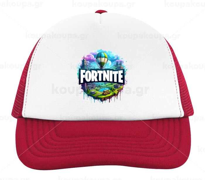 Fortnite land, Adult Soft Trucker Hat with Red/White Mesh (POLYESTER, ADULT, UNISEX, ONE SIZE)