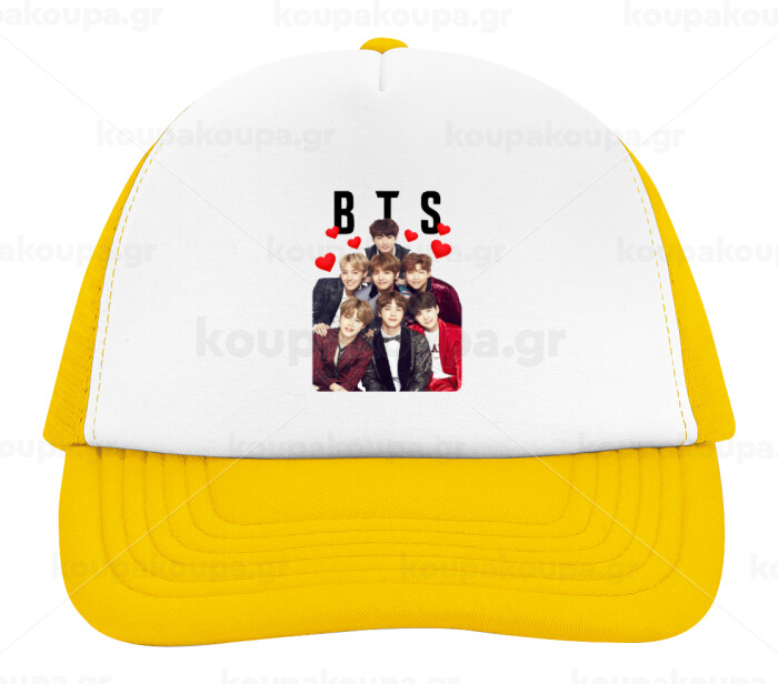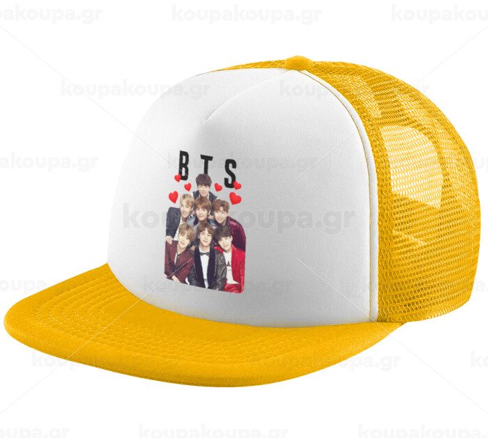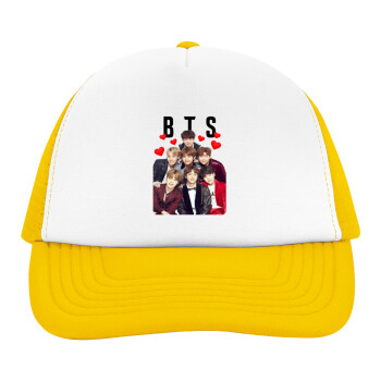 BTS hearts, Adult Soft Trucker Hat with Yellow/White Mesh (POLYESTER, ADULT, UNISEX, ONE SIZE)