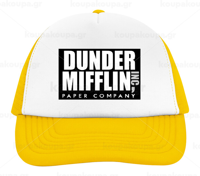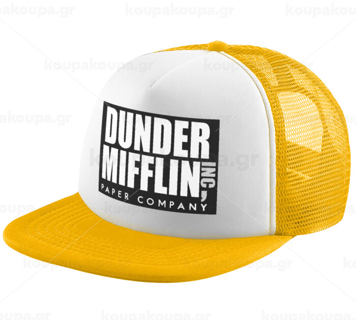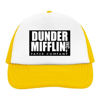 Dunder Mifflin, Inc Paper Company, Adult Soft Trucker Hat with Yellow/White Mesh (POLYESTER, ADULT, UNISEX, ONE SIZE)