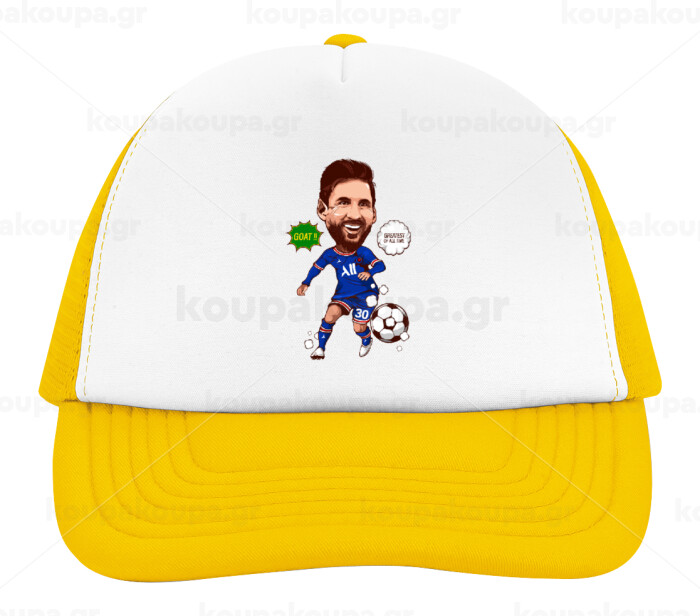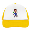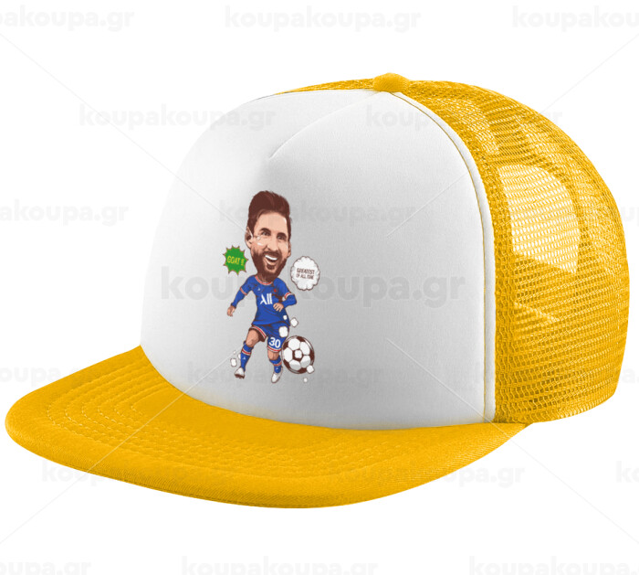 Lionel Messi drawing, Adult Soft Trucker Hat with Yellow/White Mesh (POLYESTER, ADULT, UNISEX, ONE SIZE)