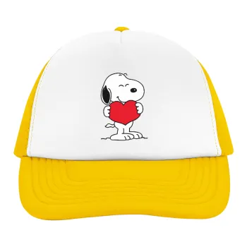 Snoopy takemy heart, Adult Soft Trucker Hat with Yellow/White Mesh (POLYESTER, ADULT, UNISEX, ONE SIZE)