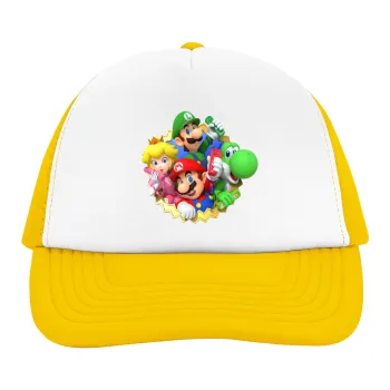 Super mario and Friends, Adult Soft Trucker Hat with Yellow/White Mesh (POLYESTER, ADULT, UNISEX, ONE SIZE)