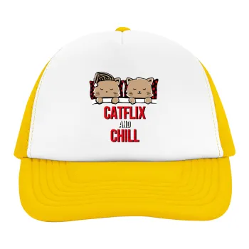 Catflix and Chill, Adult Soft Trucker Hat with Yellow/White Mesh (POLYESTER, ADULT, UNISEX, ONE SIZE)