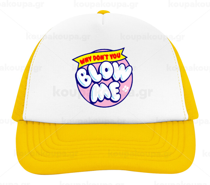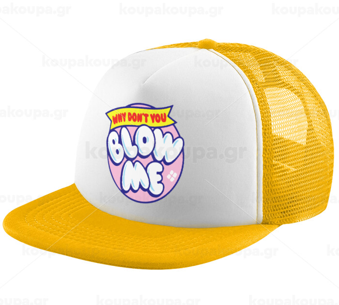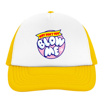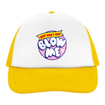 Why Don't You Blow Me Funny, Adult Soft Trucker Hat with Yellow/White Mesh (POLYESTER, ADULT, UNISEX, ONE SIZE)