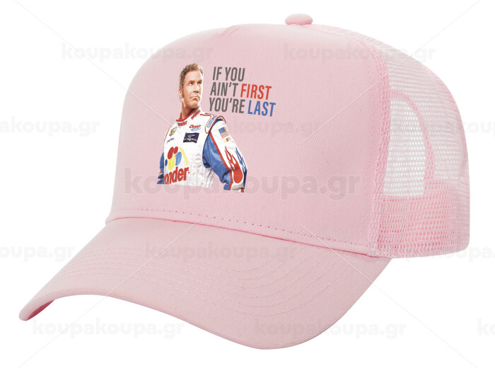 If You Ain't First You're Last Ricky Bobby, Talladega Nights, Adult Structured Trucker Hat, with Mesh, PINK (100% COTTON, ADULT, UNISEX, ONE SIZE)