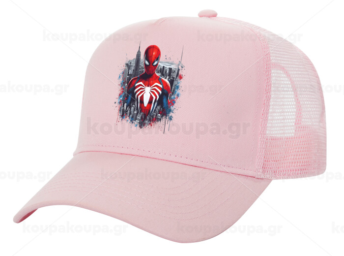 Spiderman City, Adult Structured Trucker Hat, with Mesh, PINK (100% COTTON, ADULT, UNISEX, ONE SIZE)