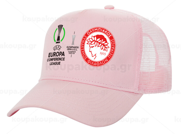 Olympiacos UEFA Europa Conference League Champion 2023/24, Adult Structured Trucker Hat, with Mesh, PINK (100% COTTON, ADULT, UNISEX, ONE SIZE)