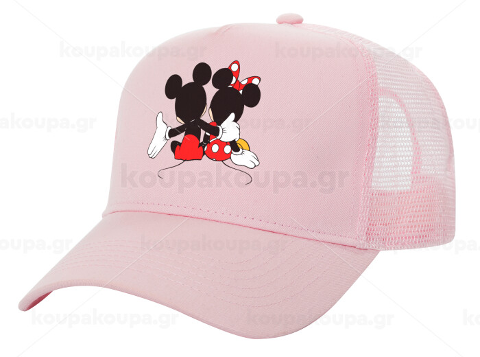 mickey and minnie hags, Adult Structured Trucker Hat, with Mesh, PINK (100% COTTON, ADULT, UNISEX, ONE SIZE)