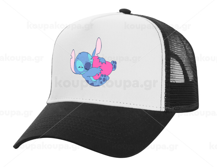 Lilo & Stitch hugs and hearts, Adult Structured Trucker Hat, with Mesh, WHITE/BLACK (100% COTTON, ADULT, UNISEX, ONE SIZE)