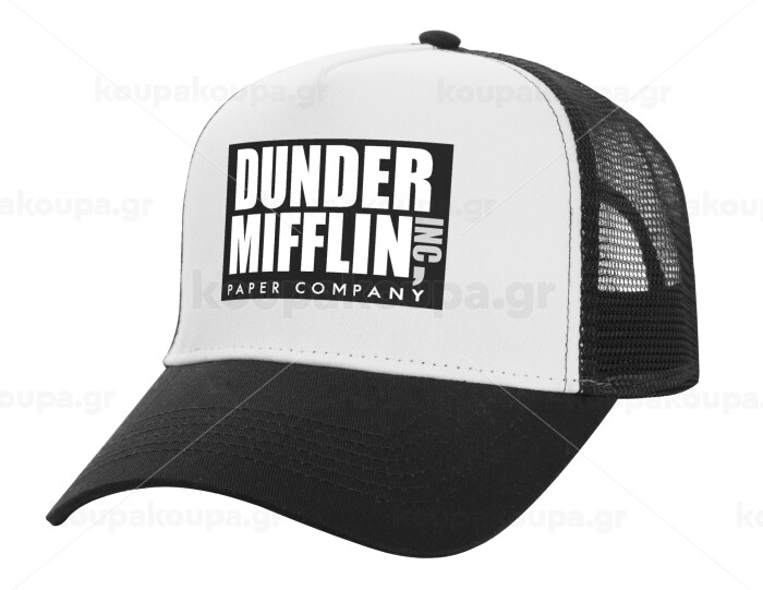 Dunder Mifflin, Inc Paper Company, Adult Structured Trucker Hat, with Mesh, WHITE/BLACK (100% COTTON, ADULT, UNISEX, ONE SIZE)