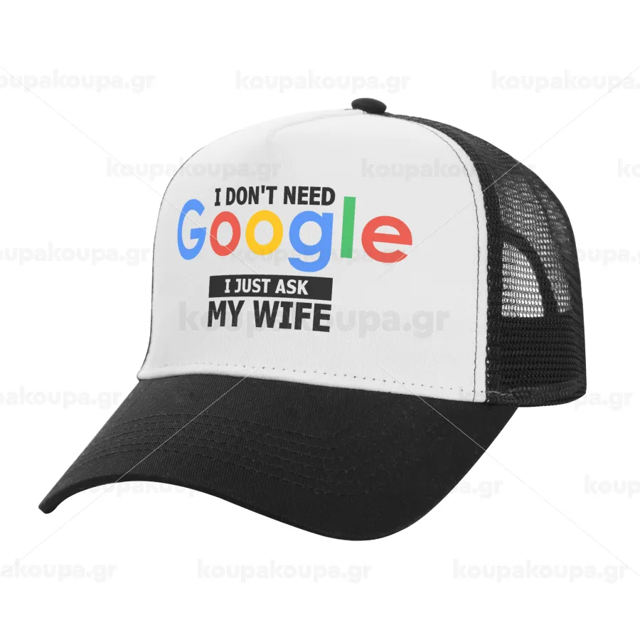 I don't need Google, just ask my WIFE, Adult Structured Trucker Hat, with Mesh, WHITE/BLACK (100% COTTON, ADULT, UNISEX, ONE SIZE)