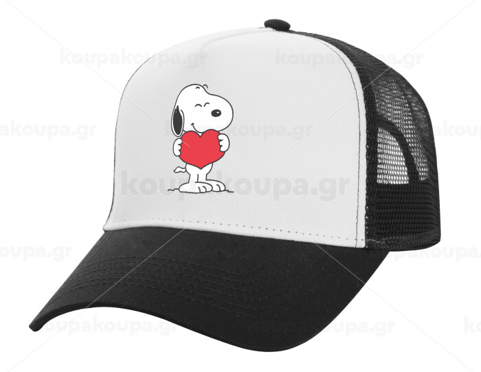 Snoopy takemy heart, Adult Structured Trucker Hat, with Mesh, WHITE/BLACK (100% COTTON, ADULT, UNISEX, ONE SIZE)