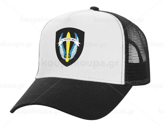 Έμβλημα Μονάδων Καταδρομών Ο Τολμων Νικα - Λοκ, Adult Structured Trucker Hat, with Mesh, WHITE/BLACK (100% COTTON, ADULT, UNISEX, ONE SIZE)