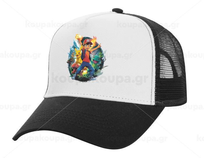 Ash Ketchum & Pikachu, Adult Structured Trucker Hat, with Mesh, WHITE/BLACK (100% COTTON, ADULT, UNISEX, ONE SIZE)