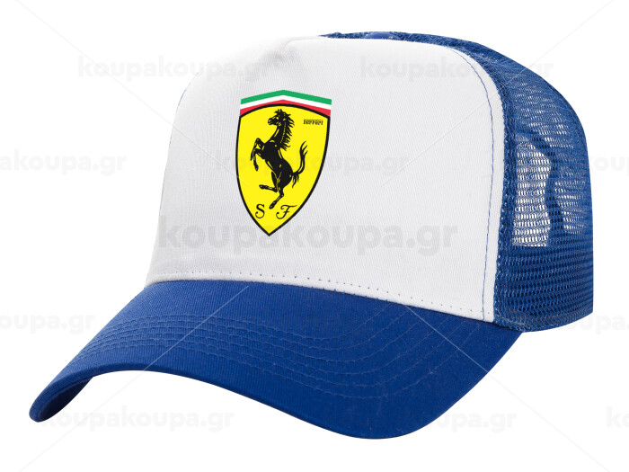 Ferrari, Adult Structured Trucker Hat, with Mesh, WHITE/BLUE (100% COTTON, ADULT, UNISEX, ONE SIZE)