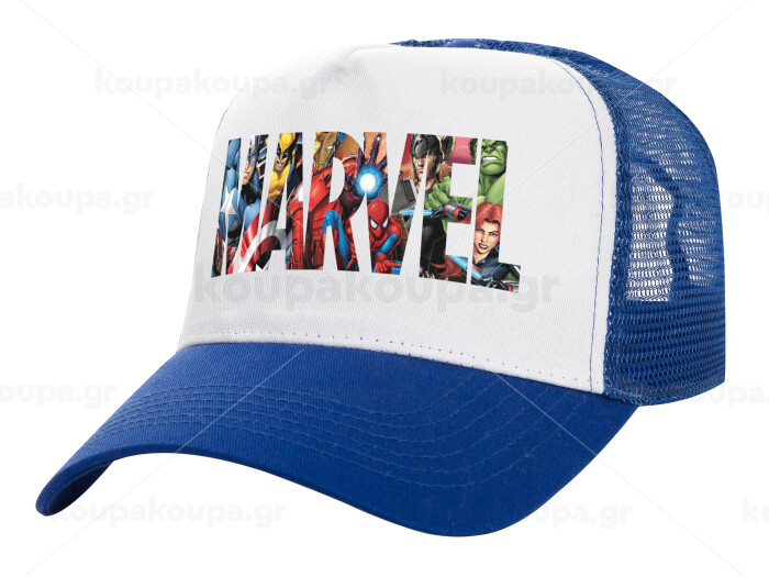 MARVEL characters, Adult Structured Trucker Hat, with Mesh, WHITE/BLUE (100% COTTON, ADULT, UNISEX, ONE SIZE)