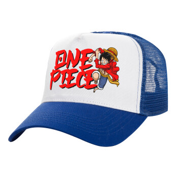 One Piece, Adult Structured Trucker Hat, with Mesh, WHITE/BLUE (100% COTTON, ADULT, UNISEX, ONE SIZE)