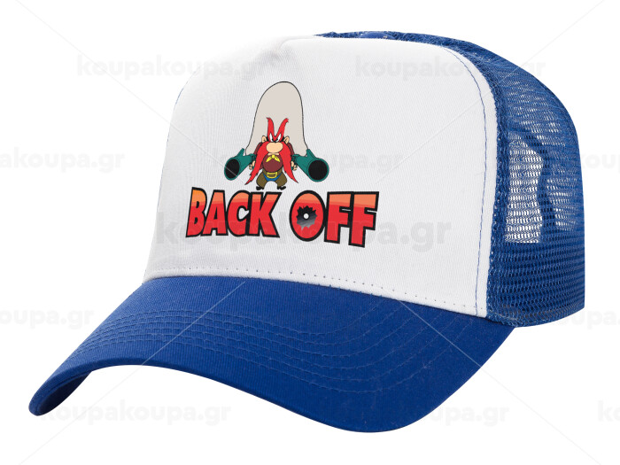 Yosemite Sam Back OFF, Adult Structured Trucker Hat, with Mesh, WHITE/BLUE (100% COTTON, ADULT, UNISEX, ONE SIZE)